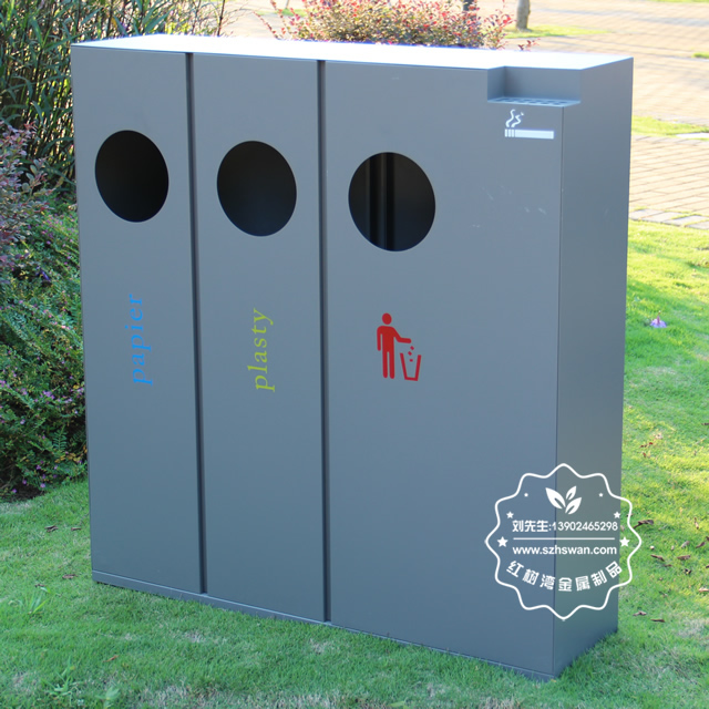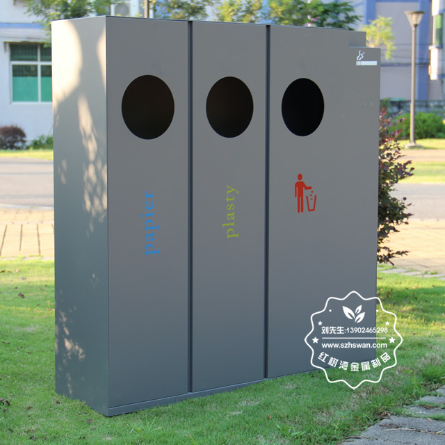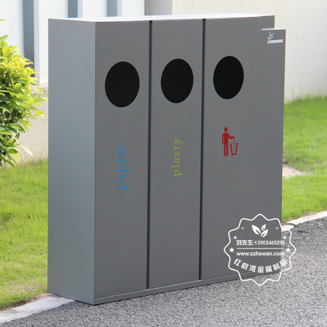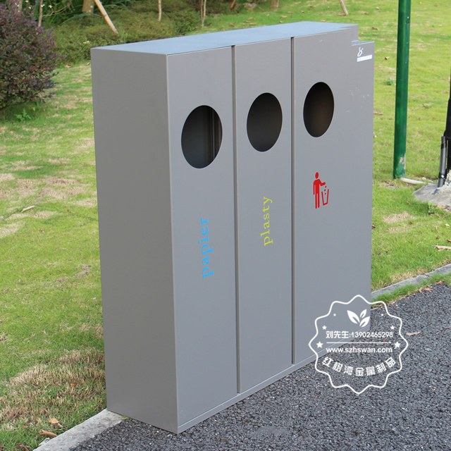 產(chǎn)品材質(zhì):出口酒店三分類鋼板垃圾桶表面經(jīng)過(guò)除油、噴砂防銹處理后,再進(jìn)行酸洗磷化處理;表面清理后整體進(jìn)行靜電噴涂或烤漆處理,靜電噴涂是經(jīng)過(guò)流水線高溫固化爐固化后再出爐冷卻,漆面色澤耐久,防腐防銹;