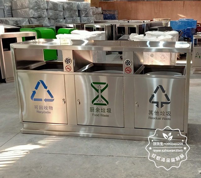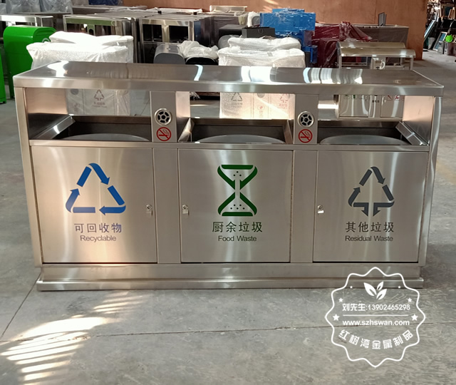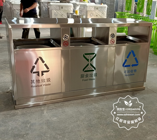 產(chǎn)品材質:戶外方形三分類不銹鋼垃圾箱采用201#,202#,304#優(yōu)質不銹鋼材料模壓成型,堅固耐用;內外表面光潔,減少垃圾殘留,易于清潔;配置鍍鋅板內桶,便于垃圾清倒;