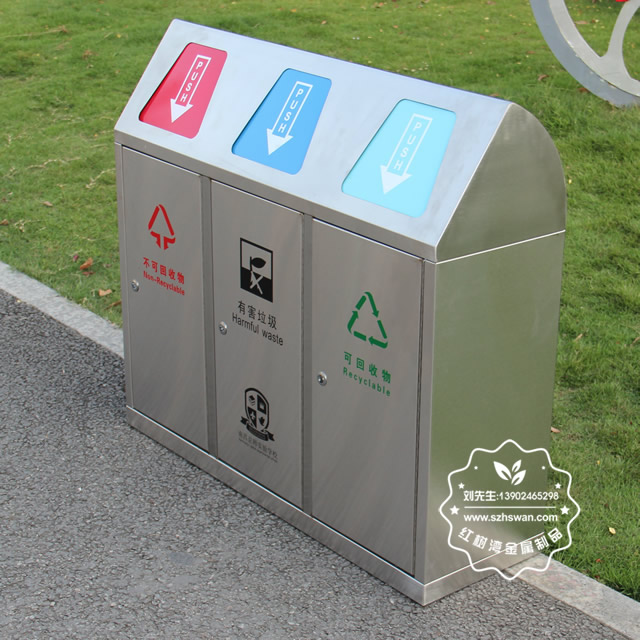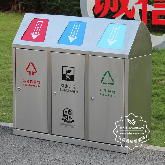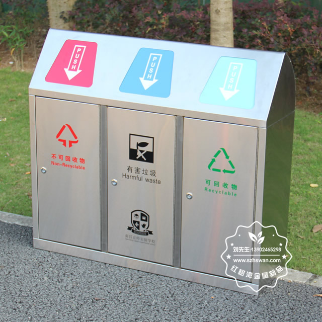 戶外學(xué)校有蓋不銹鋼分類垃圾桶采用優(yōu)質(zhì)201不銹鋼無縫焊接成型,投口模具沖壓成型,邊角精細(xì)打磨拋光圓滑不割手,高檔大氣。