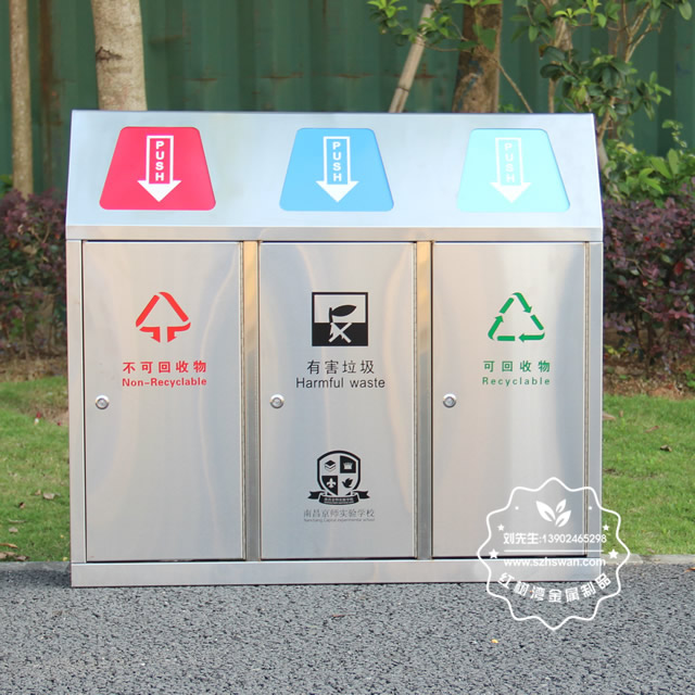 產(chǎn)品材質(zhì):戶外學(xué)校有蓋不銹鋼分類垃圾桶采用201#,202#,304#優(yōu)質(zhì)不銹鋼材料模壓成型,堅固耐用;內(nèi)外表面光潔,減少垃圾殘留,易于清潔;配置鍍鋅板內(nèi)桶,便于垃圾清倒;