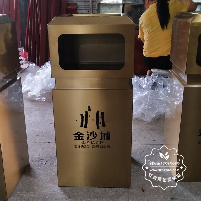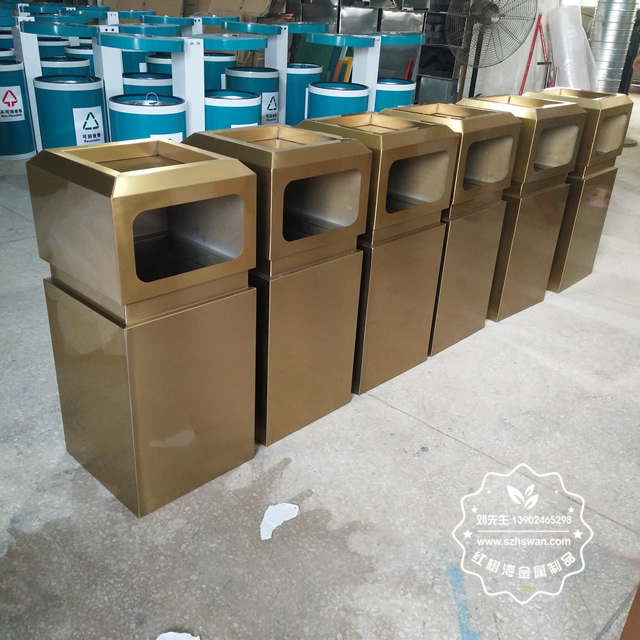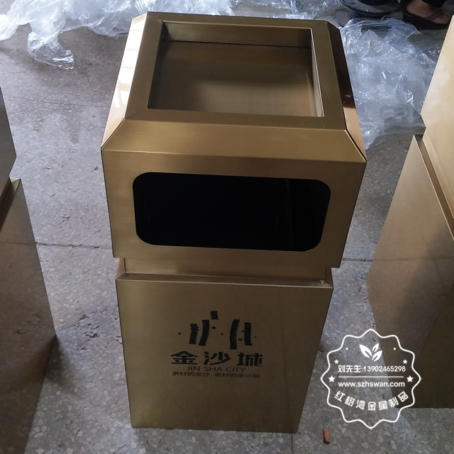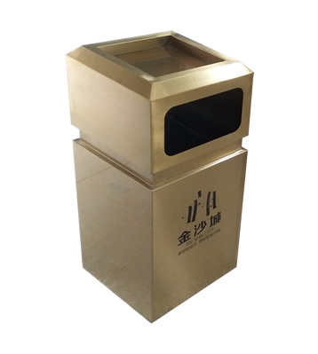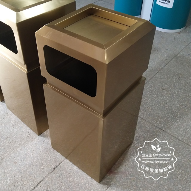 戶外電鍍土豪金方形不銹鋼果皮箱采用優質201不銹鋼無縫焊接成型,投口模具沖壓成型,邊角精細打磨拋光圓滑不割手,高檔大氣。