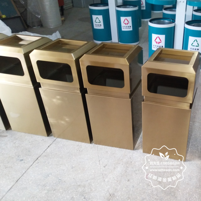 產品材質:戶外電鍍土豪金方形不銹鋼果皮箱采用201#,202#,304#優質不銹鋼材料模壓成型,堅固耐用;內外表面光潔,減少垃圾殘留,易于清潔;配置鍍鋅板內桶,便于垃圾清倒;