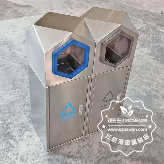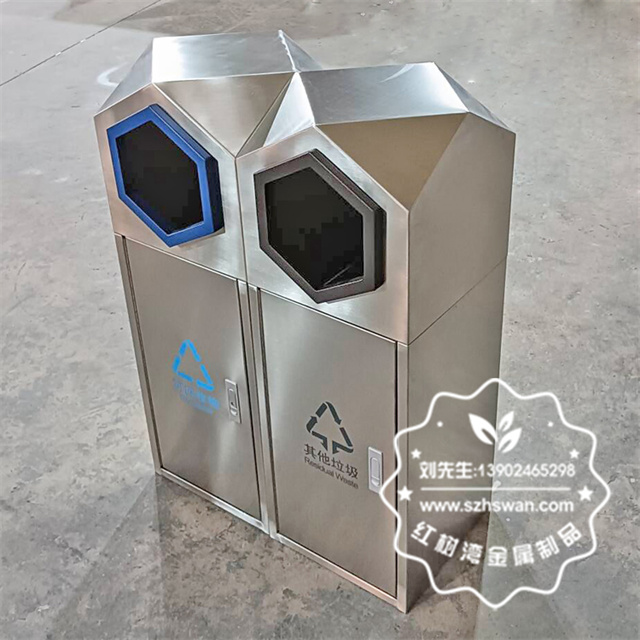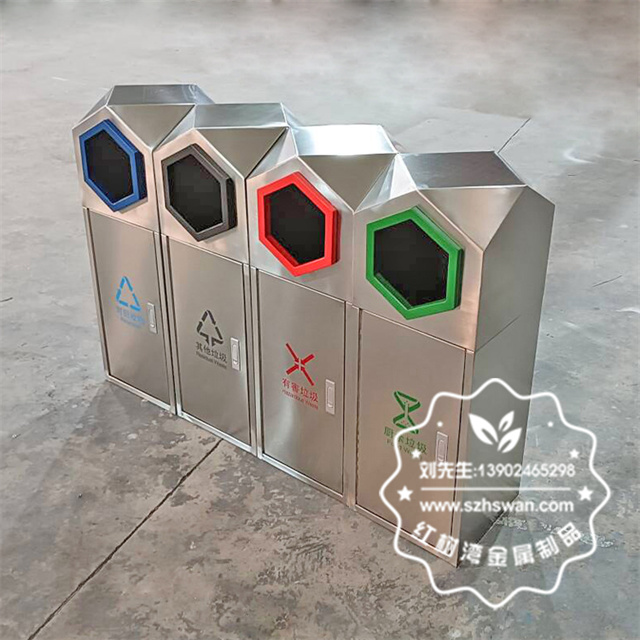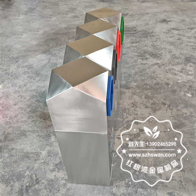 產(chǎn)品材質(zhì):室外園林組合式菱形不銹鋼分類垃圾桶采用201#,202#,304#優(yōu)質(zhì)不銹鋼材料模壓成型,堅固耐用;內(nèi)外表面光潔,減少垃圾殘留,易于清潔;配置鍍鋅板內(nèi)桶,便于垃圾清倒;