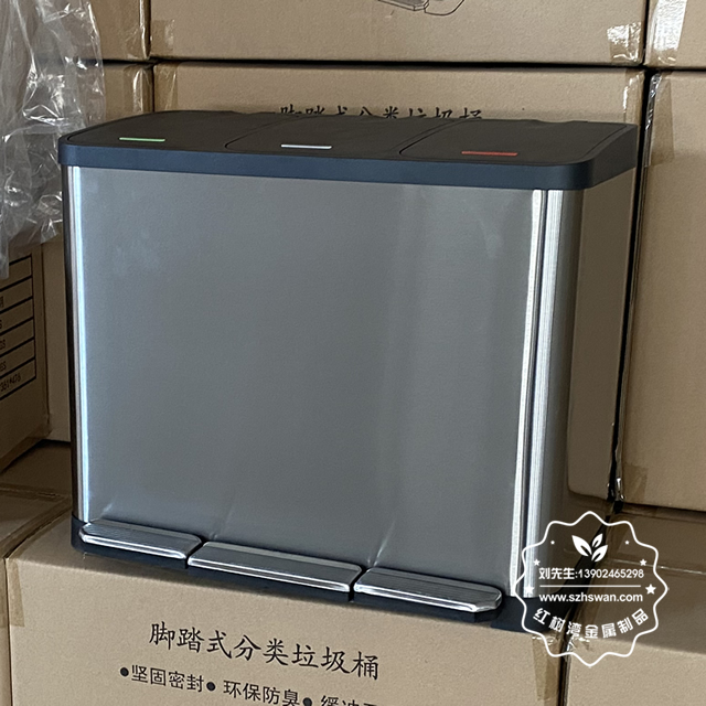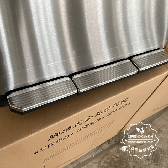 產品材質:室內小型不銹鋼腳踏式分類垃圾桶利用杠桿原理,由外筒、內筒、筒蓋、支架、連桿、踏桿等部分組成。采用201#,202#,304#優質不銹鋼材料模壓成型,產品內外光潔高檔大氣;