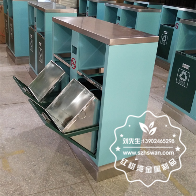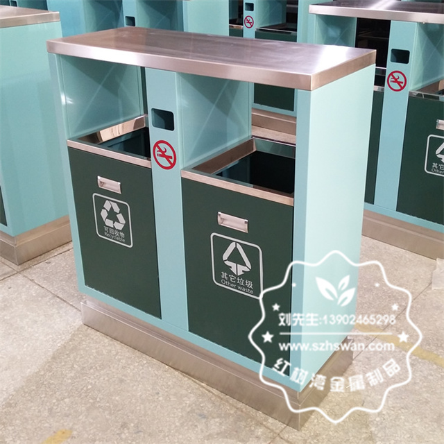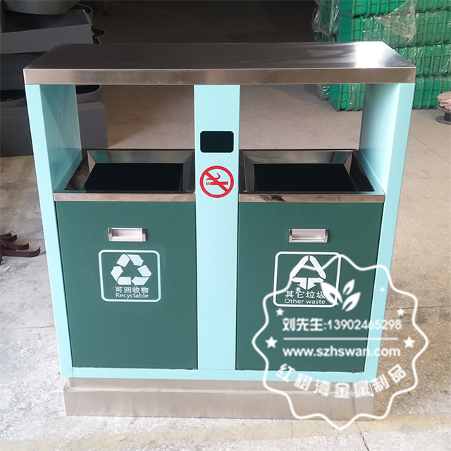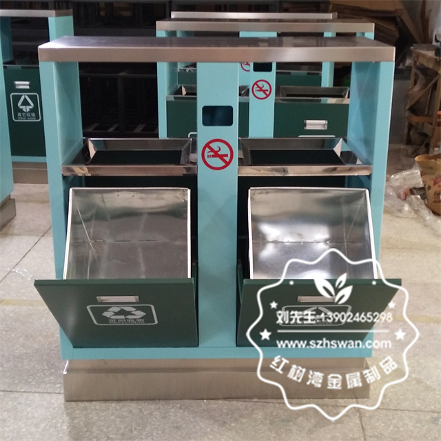產品材質:噴塑熱軋鋼板分類垃圾箱表面經過除油、噴砂防銹處理后,再進行酸洗磷化處理;表面清理后整體進行靜電噴涂或烤漆處理,靜電噴涂是經過流水線高溫固化爐固化后再出爐冷卻,漆面色澤耐久,防腐防銹;