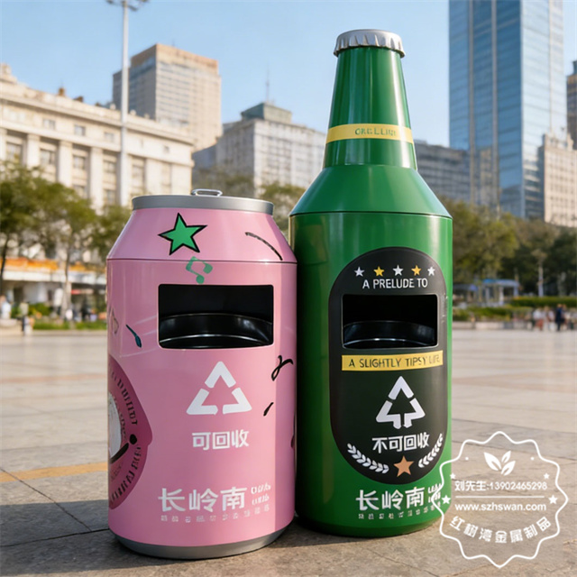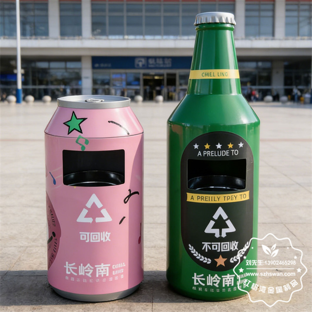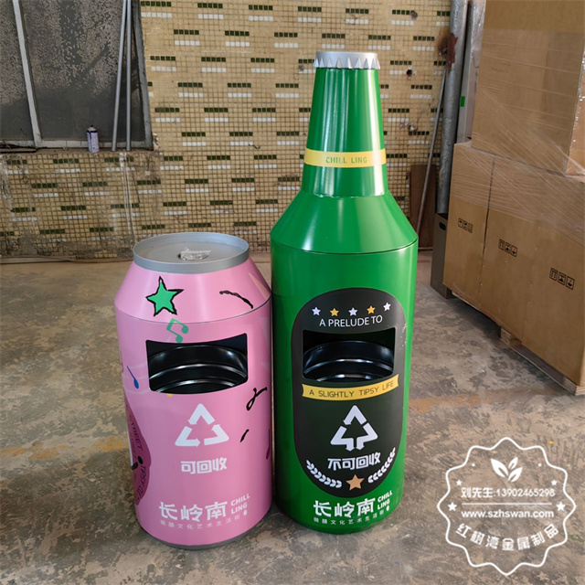 戶外啤酒瓶造型鍍鋅板鐵皮垃圾桶采用優質冷軋鋼經剪鈑折彎焊接打磨等工藝,表面經過除油防銹處理后,再進行酸洗磷化防腐防銹。