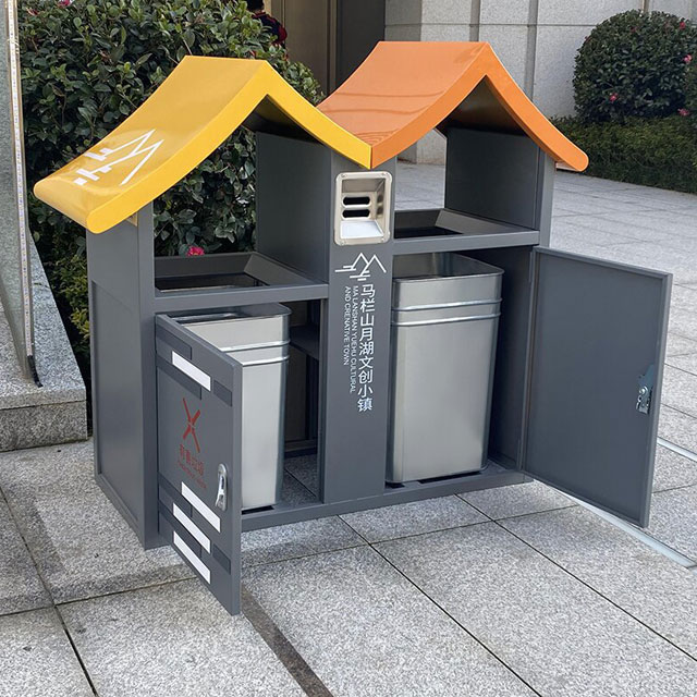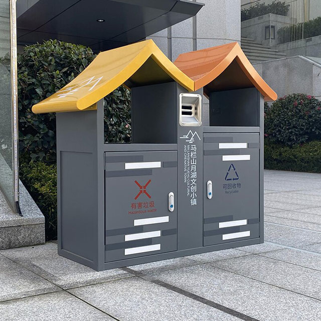 這款垃圾桶最吸引人的地方,便是其別出心裁的屋形設計。它的造型宛如一座小巧的房屋,給人一種溫馨而獨特的感覺。這種創意設計不僅打破了傳統垃圾桶單調的形象,還能很好地融入各種戶外場景,無論是在公園、小區花園,還是旅游景區,都能成為一道別樣的風景線。它為人們的生活增添了一份趣味,讓垃圾分類不再枯燥。