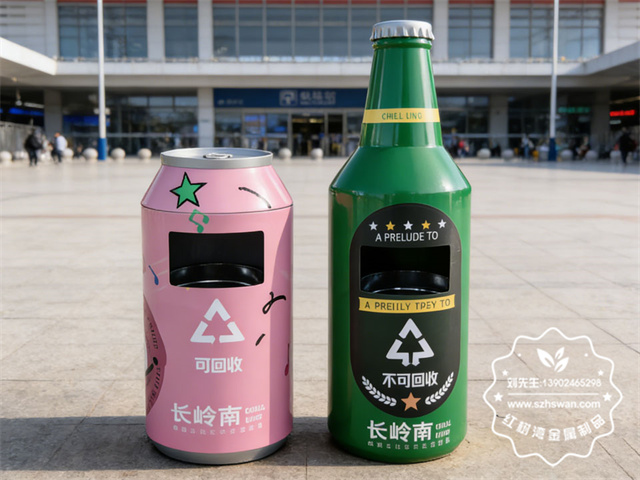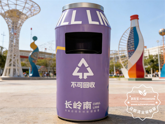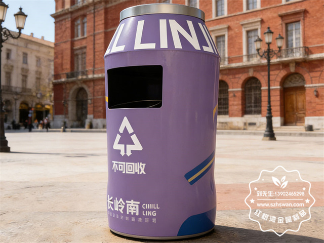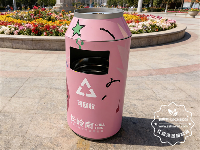 不同于一次性易拉罐的鋁材,這些定制垃圾桶采用優質鍍鋅鋼板制作。這種材料選擇不僅確保了戶外使用的耐候性和堅固度,更通過特殊的表面處理工藝,還原了易拉罐特有的金屬質感與印刷效果。