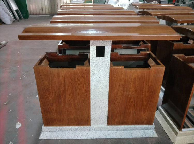基本外觀外形制作完成,仿木加仿石相結合的不銹鋼垃圾桶,最后一道制作工序便是對外觀防紫外線處理及表面內容的制作。