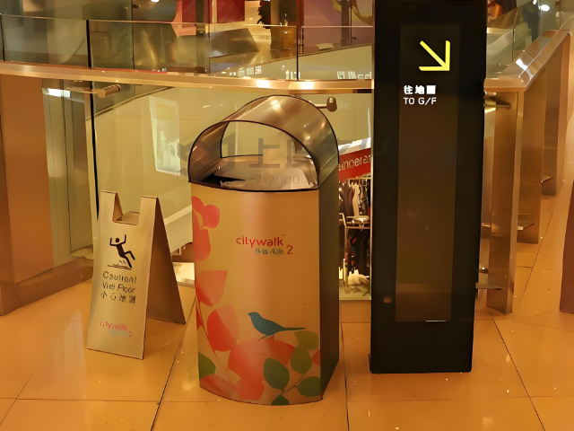 不同區(qū)域可設(shè)計差異化主題:餐飲樓層搭配食物元素插畫,影院區(qū)采用電影膠片圖案,休息區(qū)點綴自然植物紋理。這種“分區(qū)定制”策略讓垃圾桶從功能工具轉(zhuǎn)變?yōu)閳鼍盎b飾,增強(qiáng)空間敘事性。