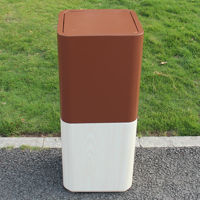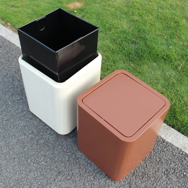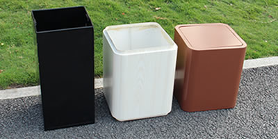 產品材質:電鍍仿木紋室內方形不銹鋼果皮箱采用201#,202#,304#優質不銹鋼材料模壓成型,堅固耐用;內外表面光潔,減少垃圾殘留,易于清潔;配置鍍鋅板內桶,便于垃圾清倒;