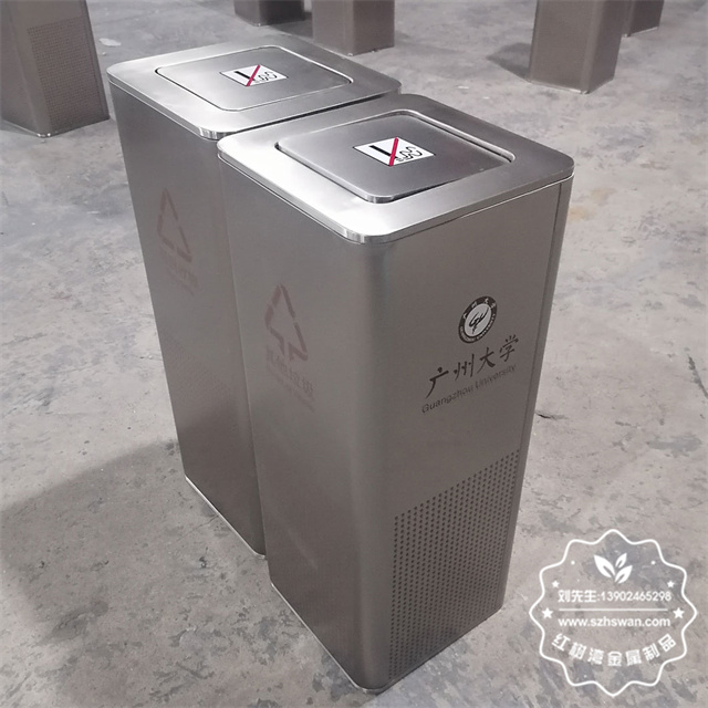 廣州大學室內方形不銹鋼分類垃圾桶采用優質304不銹鋼無縫焊接成型,投口模具沖壓成型,邊角精細打磨拋光圓滑不割手,高檔大氣。