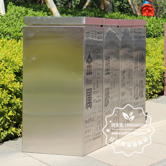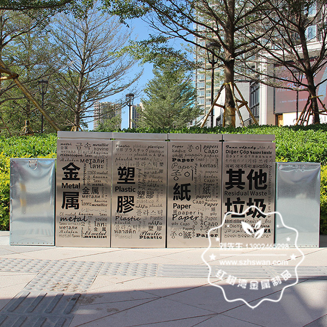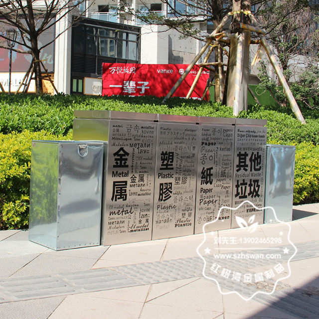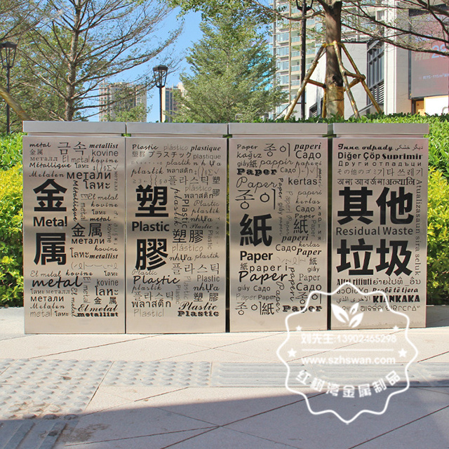 產品材質:商場創意標識四分類不銹鋼垃圾桶采用201#,202#,304#優質不銹鋼材料模壓成型,堅固耐用;內外表面光潔,減少垃圾殘留,易于清潔;配置鍍鋅板內桶,便于垃圾清倒;