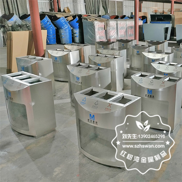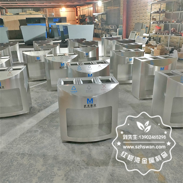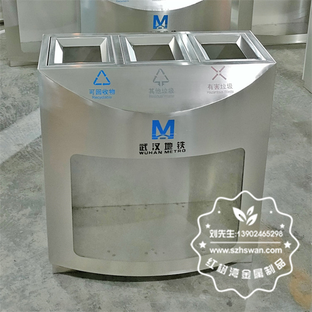 產品材質:湖北武漢地鐵站三分類不銹鋼垃圾桶采用201#,202#,304#優質不銹鋼材料模壓成型,堅固耐用;內外表面光潔,減少垃圾殘留,易于清潔;配置鍍鋅板內桶,便于垃圾清倒;