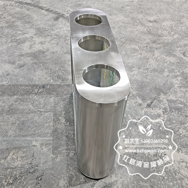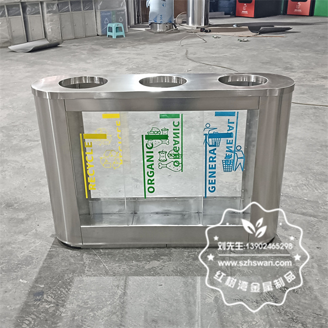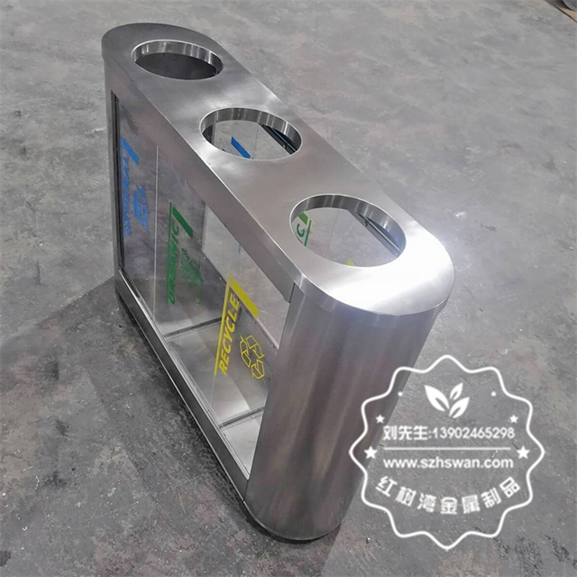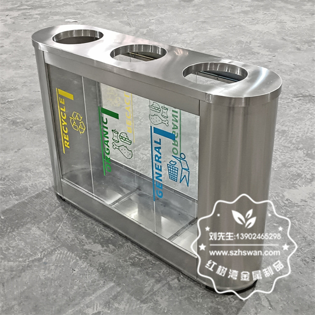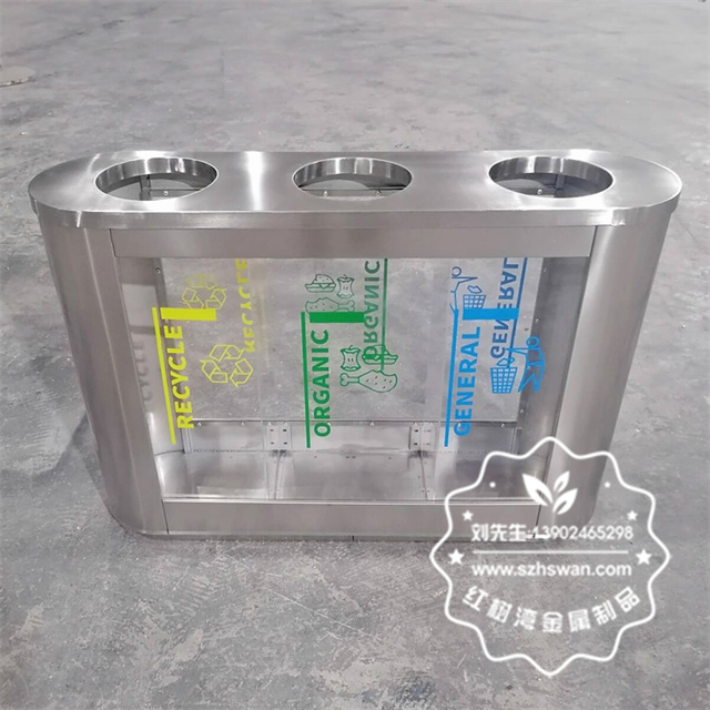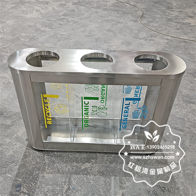 產品材質:地鐵站機場商場透明不銹鋼分類垃圾桶采用201#,202#,304#優質不銹鋼材料模壓成型,堅固耐用;內外表面光潔,減少垃圾殘留,易于清潔;配置鍍鋅板內桶,便于垃圾清倒;